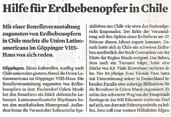 El 27. de Febrero 2010 ocurrió en Chile, un gran terremoto en Concepción, Región del Maule, seguido por un Tsunami. El sismo tuvo una magnitud de 8,8 en la escala de richter. Muchas personas perdieron todo.