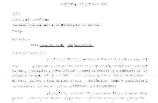 Wir möchten unseren tiefen Dank für diese Hilfe ausdrücken, die sie den Kindern und Jugendlichen aus Yunchará gewährt habt. Wir sind sehr zufrieden mit dieser wertvollen Hilfe, die wir Dank Ihnen erhalten haben und die Wirklichkeit wurde, wir sind davon überzeugt, dass diese Zusammenarbeit nicht die erste und letzte sein wird. Wir Sie sehen können, haben wir noch vieles Nötig und wir wissen, dass Sie Personen mit gutem Herzen sind und auch weiterhin unterstützen werden.